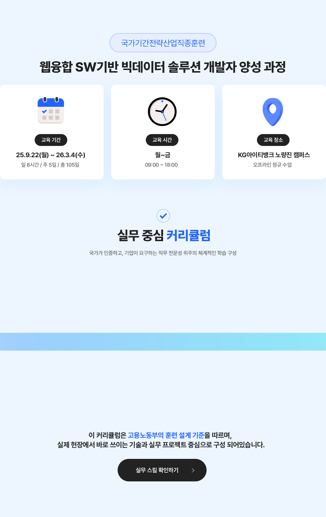 빅데이터 플랫폼 구축을 위한 프로그래밍 언어 활용, DB시스템 구축, 웹 융합 SW 개발 기술 등을 습득하여 빅데이터 솔루션 및 데이터 분석 기법을 활용한 SW전문가로 취업하는 과정